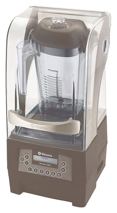 БлендерVitamixThe Quiet Oneпредназначен для измельчения и смешивания замороженных и свежих овощей и фруктов, порошковых смесей и любых твёрдых ингредиентов в барах, кафе и ресторанах с большой проходимостью.Благодаря дополнительному звукопоглощающему кожуху использование блендера в зале становится менее незаметным для посетителей.Кувшин выполнен из поликарбоната.