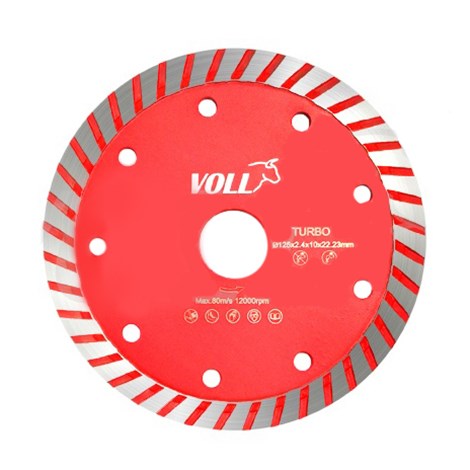 Универсальный алмазный кругс турбо-насечками имеет диаметр 230 мм и режущую кромку толщиной 2,4 мм. Применяется для резки армированного бетона, гранита, мрамора и кирпича. Эффективно производит рез как с водяным охлаждением, так и без него. Устанавливается на ручной электроинструмент с подходящим посадочным отверстием диаметром 22,23 мм.
