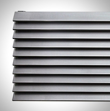 Дизайн-радиатор из горизонтальных наклонных пластин. Выполнен из нержавеющей стали. Подходят для работы в закрытой системе отопления, от электричества, а также в комбинированном режиме.