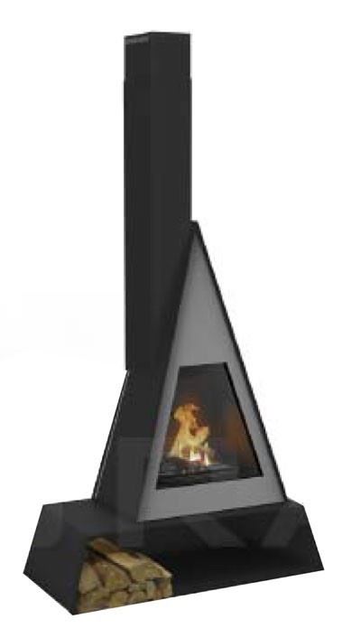 - Пристенный треугольный камин с вертикальной трубой сбоку и боковой дверцей для загрузки дров