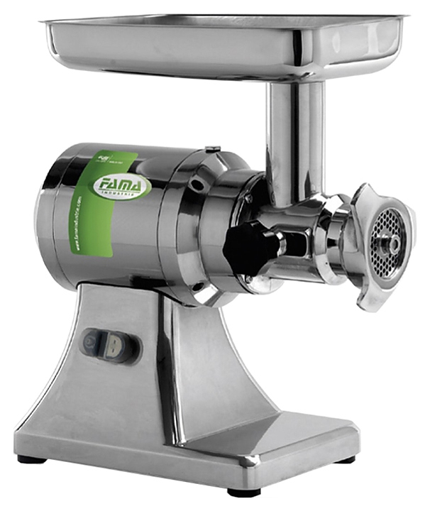 Мясорубка Fama TS 22 FTS 117E предназначена для измельчения мяса и рыбы на фарш, повторного измельчения котлетной массы и набивки колбас на предприятиях общественного питания и торговли. Корпус выполнен из литого под давлением алюминиевого сплава, решетка и самозатачивающийся нож - из нержавеющей стали,шнек - из сплава никеля.