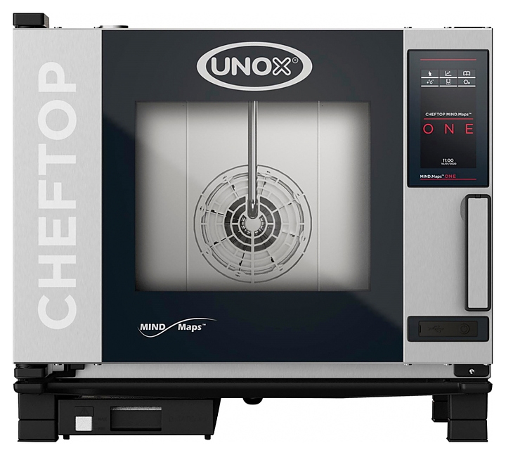 Пароконвектомат UNOX XEVC-0511-E1RM серии CHEFTOP MIND.Maps ONE предназначен для приготовления различных блюд, выпечки хлебобулочных и кондитерских изделий на предприятиях общественного питания и торговли, в пекарнях и кондитерских. Модель оснащена встроенной в дверь светодиодной LED-подсветкой и C-образными с зубчатыми нишами направляющими. Внутреннее открывающееся стекло облегчает чистку и обеспечивает максимальную гигиену. Камера с закругленными углами выполнена из нержавеющей стали AISI 304, направляющие - из профилированной стали, дверной замок - из высокопрочного самосмазывающегося технополимера, внутренний штифт дверной ручки - из углеродного волокна.