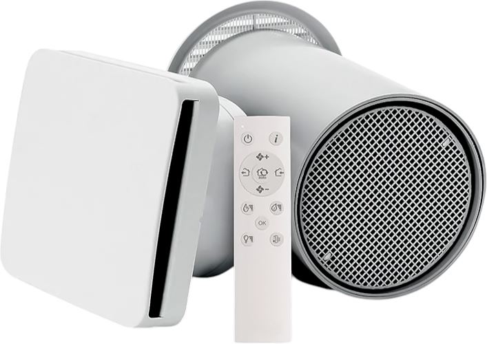 - Включает в себя рекуператор тепла, решётку и пульт дистанционного управления