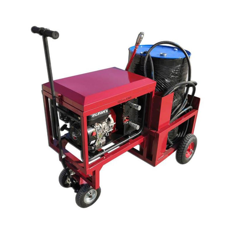 Конструкция: рабочие механизмы расположены на устойчивой передвижной тележки с тремя колесами. Подогрев материалов производится мощной газовоздушной горелкой с 27-литровым баллоном. Для загрузки и подачи эмульсии требуется приобрести бочку объемом 200 литров.