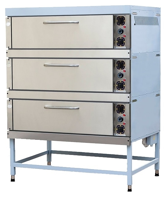 Пекарский шкафONEGA ШПЭНМр-3 Ппредназначендля выпечки широкого ассортимента хлебобулочных и кондитерских изделий, а также тепловой обработки различных продуктов на предприятиях пищевой промышленности, общественного питания и торговли. Модель оснащена 3 рабочими камерами с откидными дверьми с горизонтальнымирукоятками, подставкой и 3 электромеханическими панелями управления. Корпус выполнен из оцинкованной стали, фронтальная облицовка и двери из нержавеющей сталиAISI430, противни из углеродистой стали.