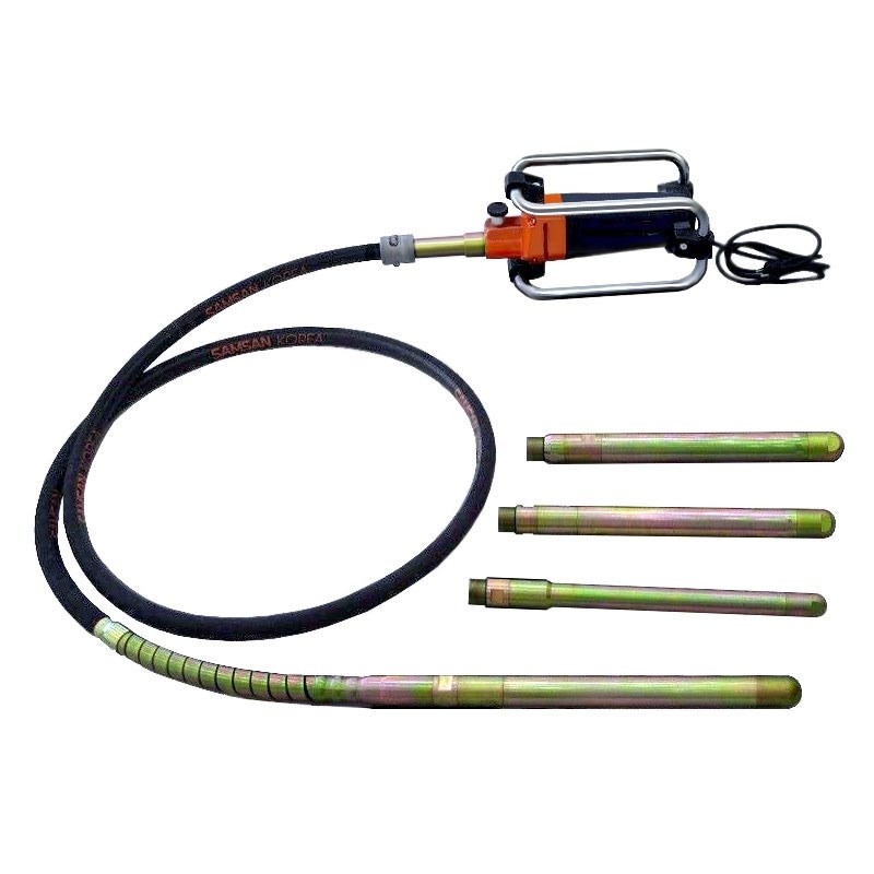 Комплект из гибкого вала и булавы, разработанный специально для приводов Samsan KVM 1500 и KVM 2300. Диаметр вибронаконечника (3,8 см) позволяет работать с армированными поверхностями. Маятниковый шланг отлично передаёт вибрации вглубь уплотняемого бетонного раствора, эффективно удаляя излишки воздуха и влаги для прочности возводимой конструкции.