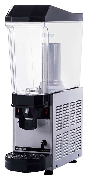 Сокоохладитель Samixir 1Sиспользуется в ресторанах, кафе, барах, супер- и гипер-маркетах, магазинах, на предприятиях уличной торговли и в развлекательных центрах для охлаждения и розлива различных сокосодержащих напитков. Модель оснащена механическим термостатом, магнитными форсунками и системой смешивания, емкостьюиз ударопрочного поликарбоната и двухслойнойкрышкой. Сокоохладитель работает на хладагенте R134a.