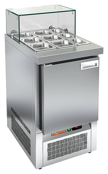 Стол для салатов HICOLD SLE3-1GN используется на предприятиях общественного питания и торговли для охлаждения и кратковременного хранения ингредиентов, используемых для приготовления салатов, закусок и сэндвичей, а также других скоропортящихся продуктов и напитков. Корпус и столешница выполнены из нержавеющей стали.