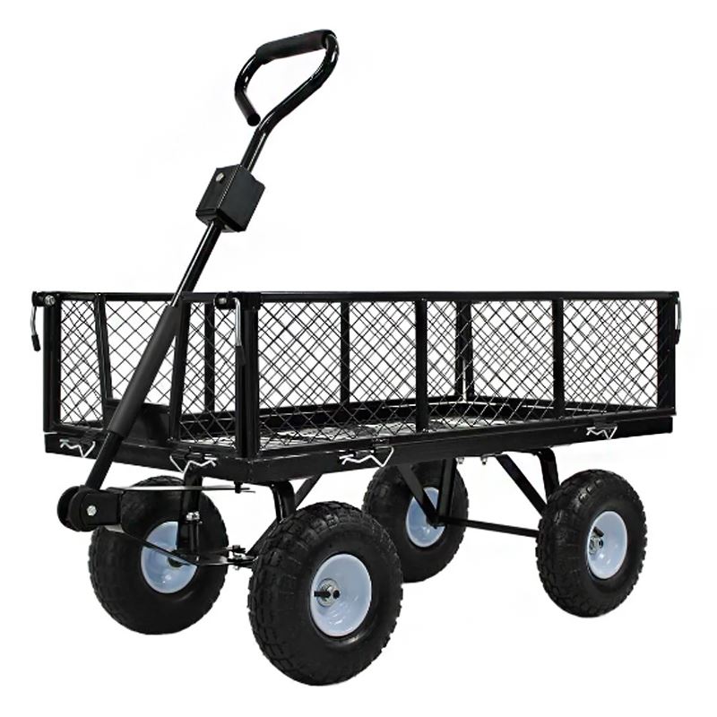Конструкция из цельносварной стальной трубы Сетчатые съемные борты платформы Удобная съемная рукоять управления Пневматические колеса для перемещения