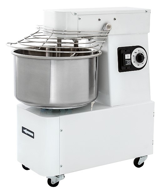 Тестомес спиральный имеет в своейконструкциидежу, спиралевидный месильный орган, тесторазделительный стержень, крышку, колеса, приводной механизм икрюк из нержавеющей стали. Оборудование настольноеоснащено таймером.