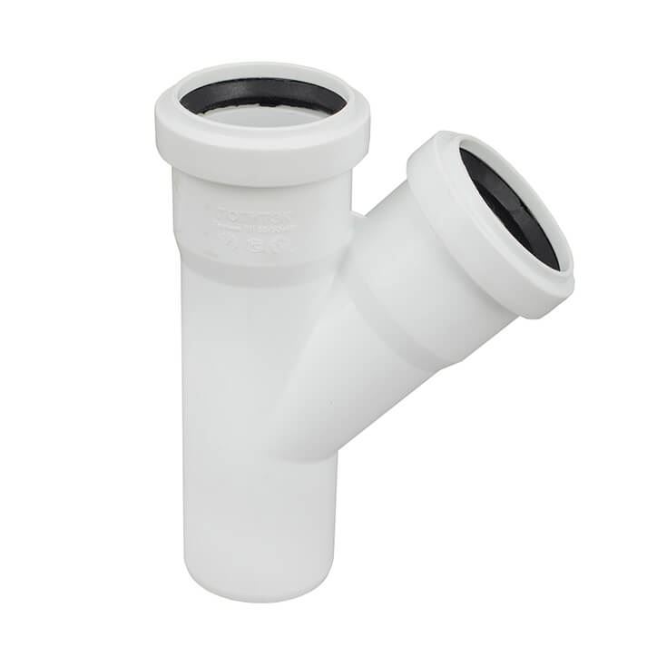 Тройники равнопроходные белые в канализационных системах с улучшенным шумопоглощением предназначены для подключения к трубопроводу диаметром 110 мм и 50 мм дополнительного ответвления под различными углами (45о и 87о).Отвод тройника имеет диаметр равный проходному диаметру.