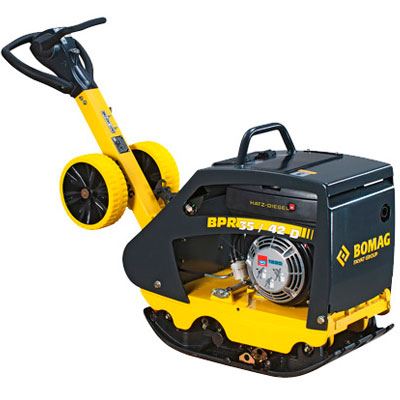 Вибротрамбовочная машина Бомаг относится к типу реверсивных виброплит. Она предполагает работу по уплотнению брусчатки, песка, бетона, гравия, грунту, щебню. Имеет надежный и мощный дизельный двигатель, который защищает от внешних повреждений защитная рама. Плита предусматривает электрический запуск и имеет воздушную систему охлаждения. Рукоять управления имеет очень удобную форму и систему гашения вибрации, также она может быть отрегулирована под оператора по высоте. Данные свойства позволяют работать долго не чувствую усталости. Двигатель плиты способен работать бесперебойно в течение длительных промежутков времени.