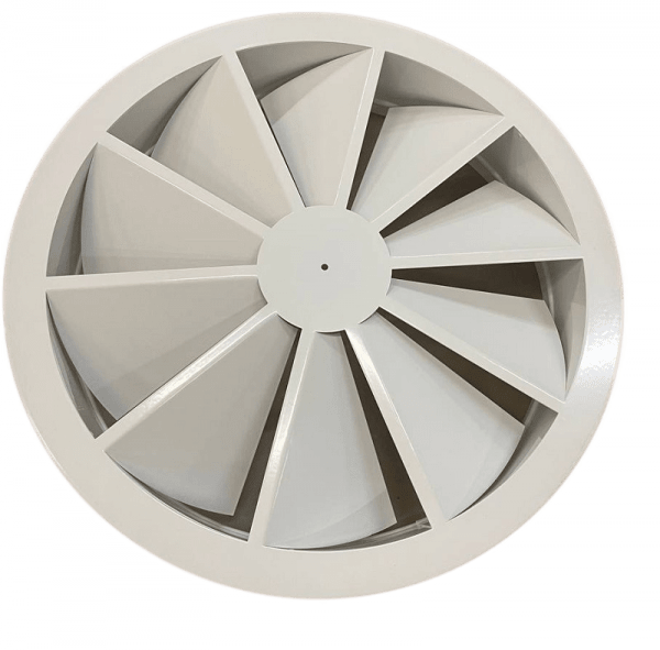 Вихревой нерегулируемый воздухораспределитель РЭД-1ДКЗ и 2ДКЗ предназначен для монтажа в систему вентиляции и отопления в помещениях с высокими потолками. Он позволяет подавать охлажденный воздух в горизонтальных плоскостях, теплый воздух вертикально, а также изотермический воздух. Подает вертикально закрученную коническую стрю.