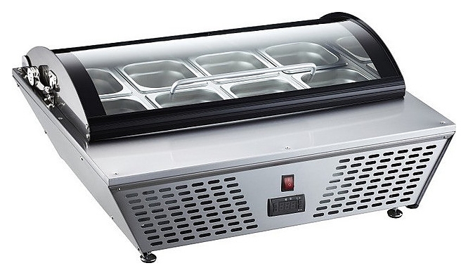 Витрина для мороженого Koreco RTD67L используется на предприятиях общественного питания и торговли для демонстрации и хранения мороженого, сорбета и йогурт-мороженого. Корпус трапециевидного сечения, зауженный к низу, выполнен из нержавеющей стали, крышка - из стекла.